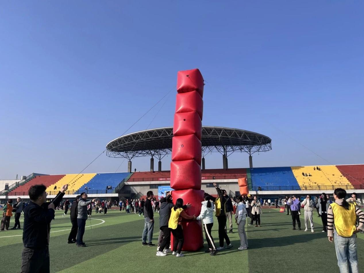 “步步高升”项目中,队员们需分工协作,用指定方块搭建多层结构并保持一定时间不倒塌。比赛开始后,队员们迅速明确分工:有的负责搬运方块,有的专注定位搭建,有的则在旁观察调整。大家屏息凝神,小心翼翼地将方块逐层叠加,从底层的扎实铺垫到上层的精准对接,每搭建一层都反复确认稳定性,充分展现了教职工们的耐心、细心与协作意识。