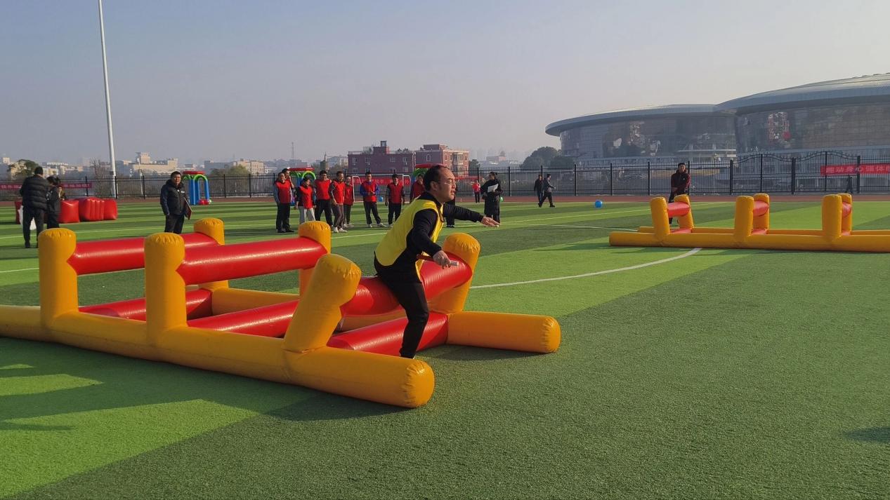 “智勇大冲关”赛道上,跨栏、平衡气垫、弧形通道等多重障碍依次排开,选手需以接力形式完成全程。起跑声落,首棒老师飞速冲刺,灵活越栏、平稳过垫、俯身钻网,随后精准将接力棒传递给下一位队员。各队配合默契,部分选手手脚并用提速闯关,现场喝彩声、呐喊声此起彼伏,每一次顺利交接都赢得阵阵欢呼。