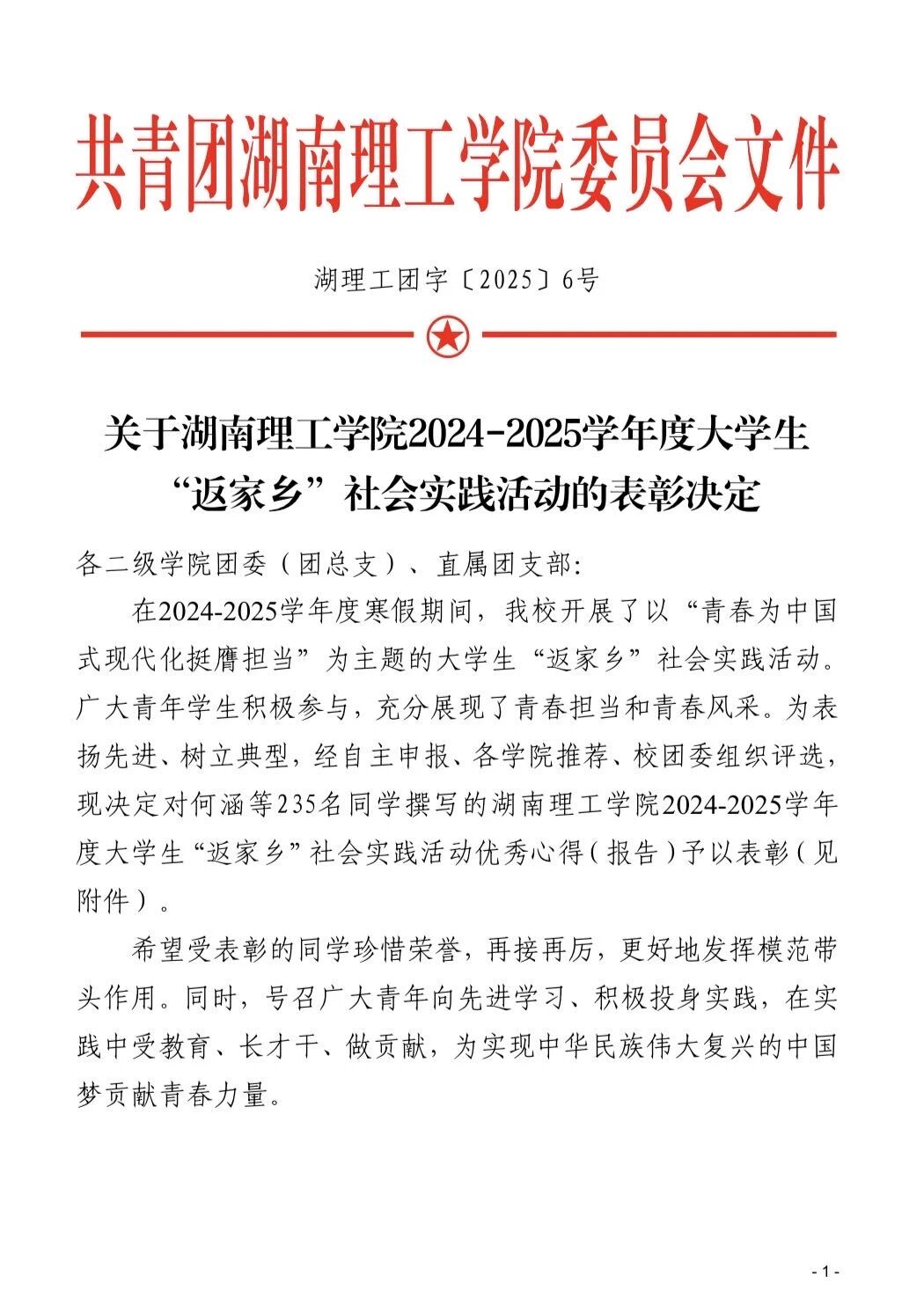 “返家乡”社会实践活动表彰决定